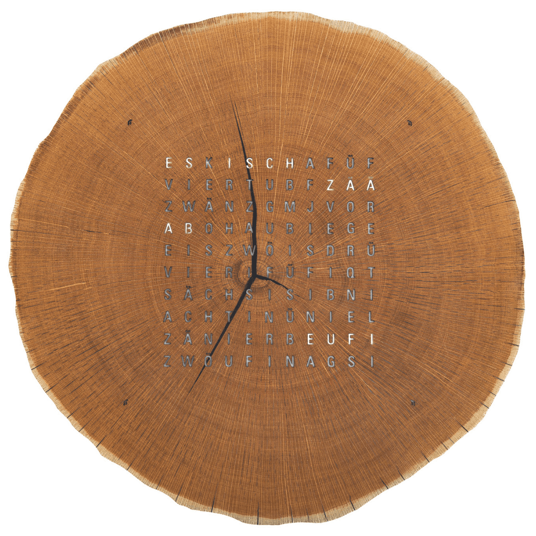 Unsere Wortuhren zeigen die Zeit in der Regel in 5-Minuten-Schritten an (z.B. „fünf nach“, „zehn nach“, „viertel“, „halb“ usw.). Dadurch bleibt die Anzeige klar, elegant und sehr gut lesbar.