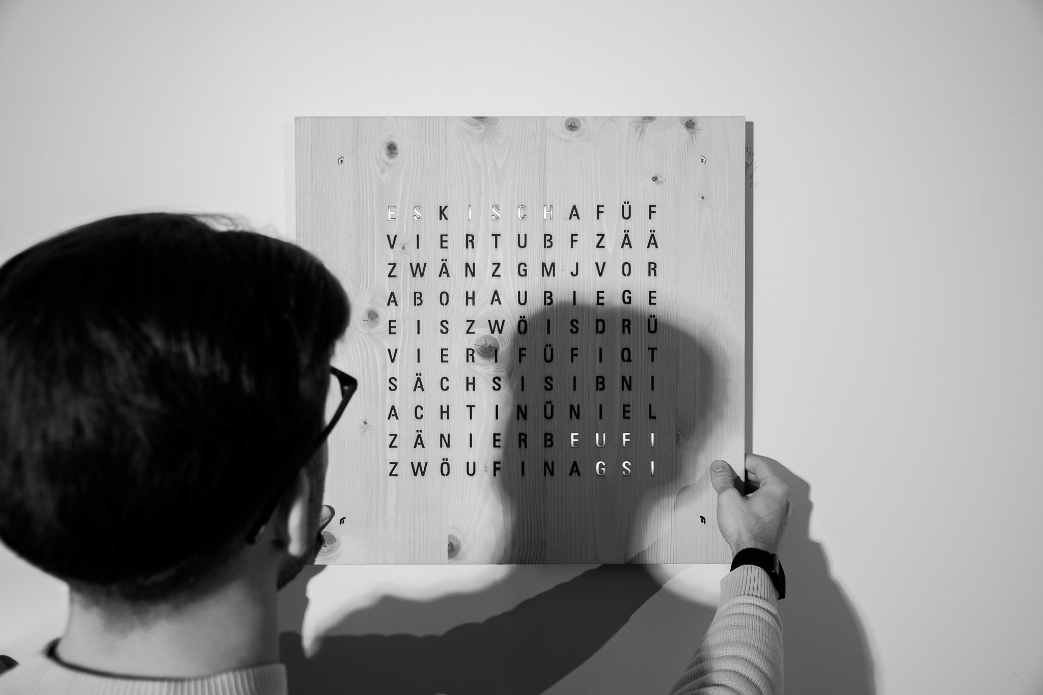 Die Uhr beleuchtet automatisch die passenden Wörter, die zusammen einen kurzen Satz ergeben. Die Zeit wird dabei stets in klaren 5-Minuten-Schritten angezeigt; die vier Eckpunkte markieren die Minuten dazwischen. So lässt sich die Uhr jederzeit minutengenau lesen. Nach kurzer Zeit liest du die Uhr ganz intuitiv – ähnlich wie beim Lesen eines kurzen Textes.